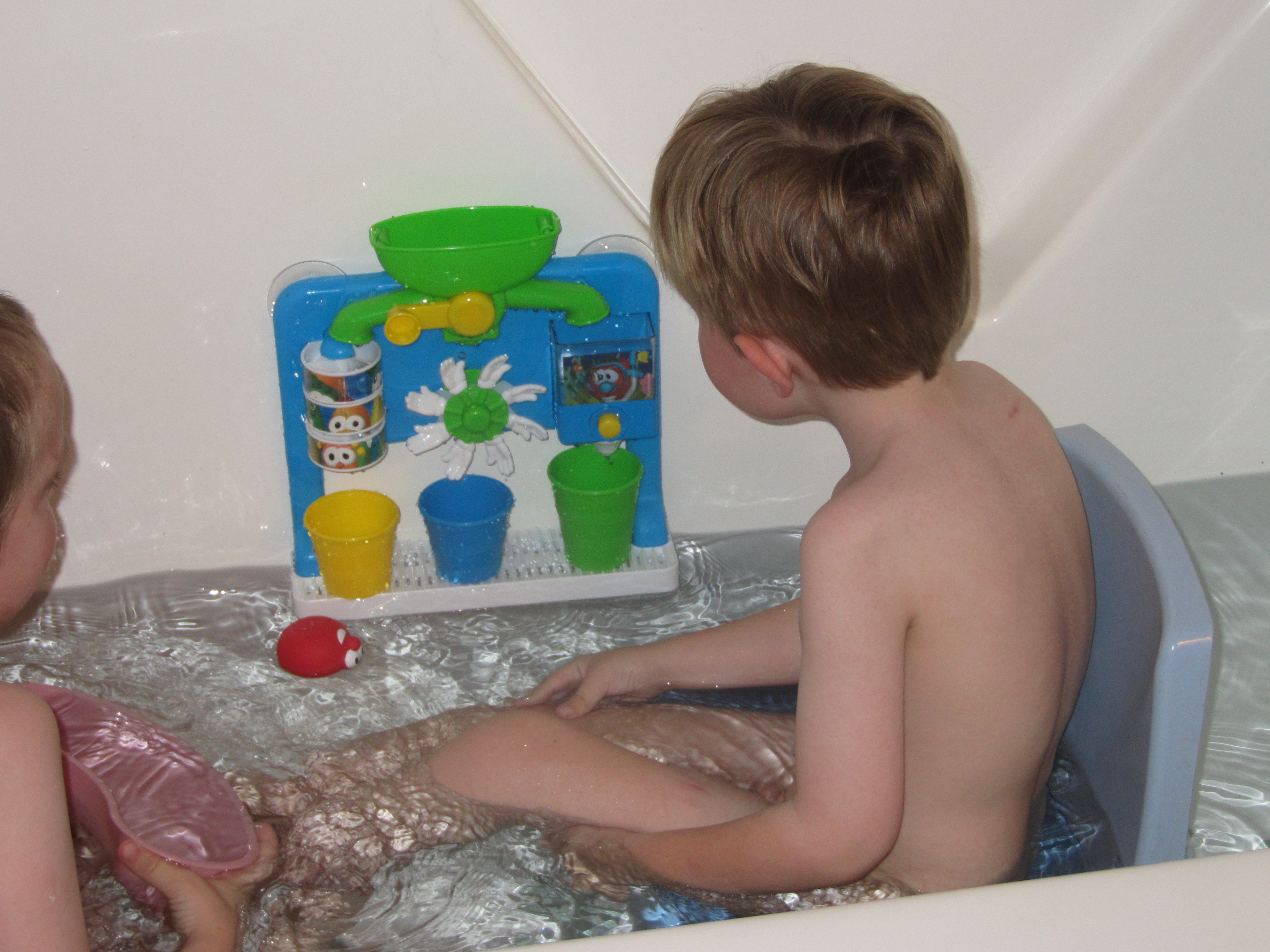We looked at buying a bathtub seat for John, but they were all big and clunky, and we didn’t think they would work well for us — especially since the bathroom is used by more than one person. We just discovered by accident that a plastic booster seat is perfect for what we need right now.