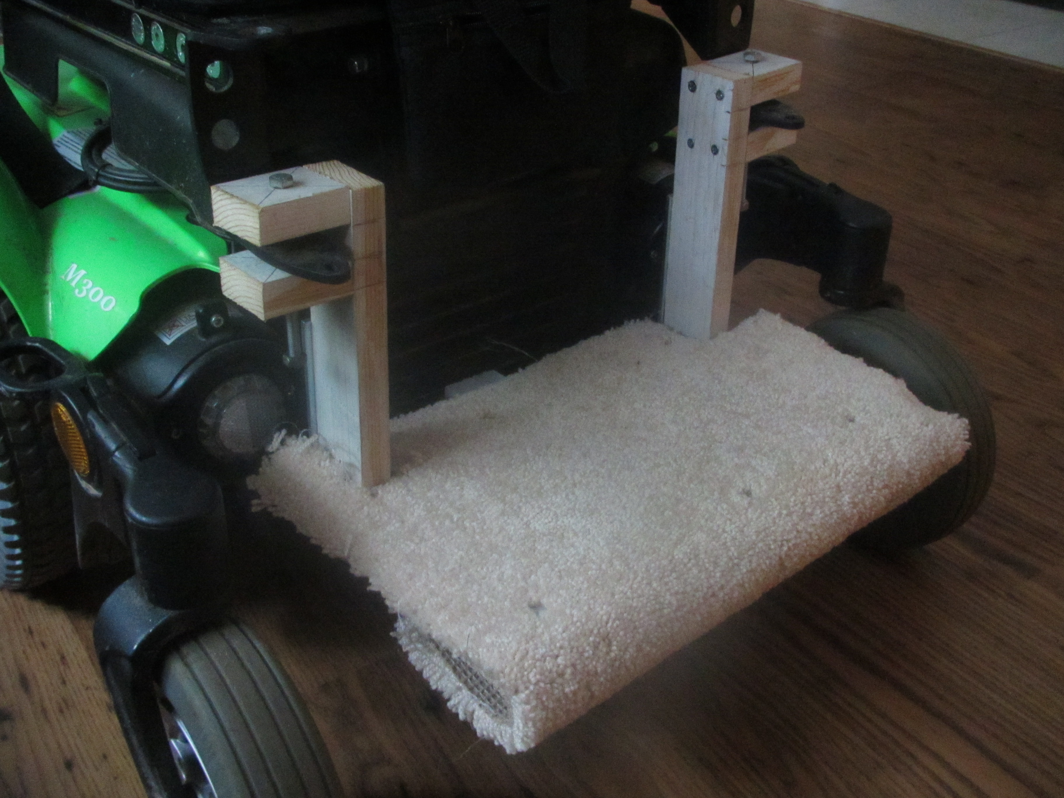 I went to Sears and asked for a box. They kindly unpackaged a washing machine for display on the spot and gave me the box. I thought I’d have to build some kind of structure to hold the box up, but it rested perfectly on the footrests in the front and on the wheelchair frame in the back.