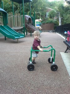 In just over a month since Arlo started using the walker – he has taken his first independent steps. Just a few small ones, and it was one of the most joyous moments in our lives. It didn’t take him long to fall in love with the walker. He went from reluctance to adoration within days. Now he is running in the walker and we’re chasing him around the dog park. We take the walker everywhere. It’s lightweight and durable and hooks on to the front of the stroller – we can also just throw it over our shoulders. We went to the zoo recently and he was more interested in walking than the animals. Everyone comments on how great it is. And if Arlo leaves it alone for a second – all of the typical kids swarm to play with it. The walker is by far the best tool we’ve added to Arlo’s therapy arsenal. Jennifer – thank you so very much.